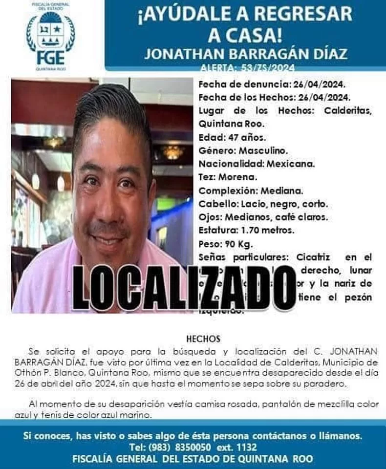 Chetumal, 27 de abril (Infoqroo).- El cuerpo del empresario chetumaleño Jonathan Barragán fue encontrado esta mañana en el bulevar Bahía de la capital, apenas unas horas después de que se reportó su desaparición.