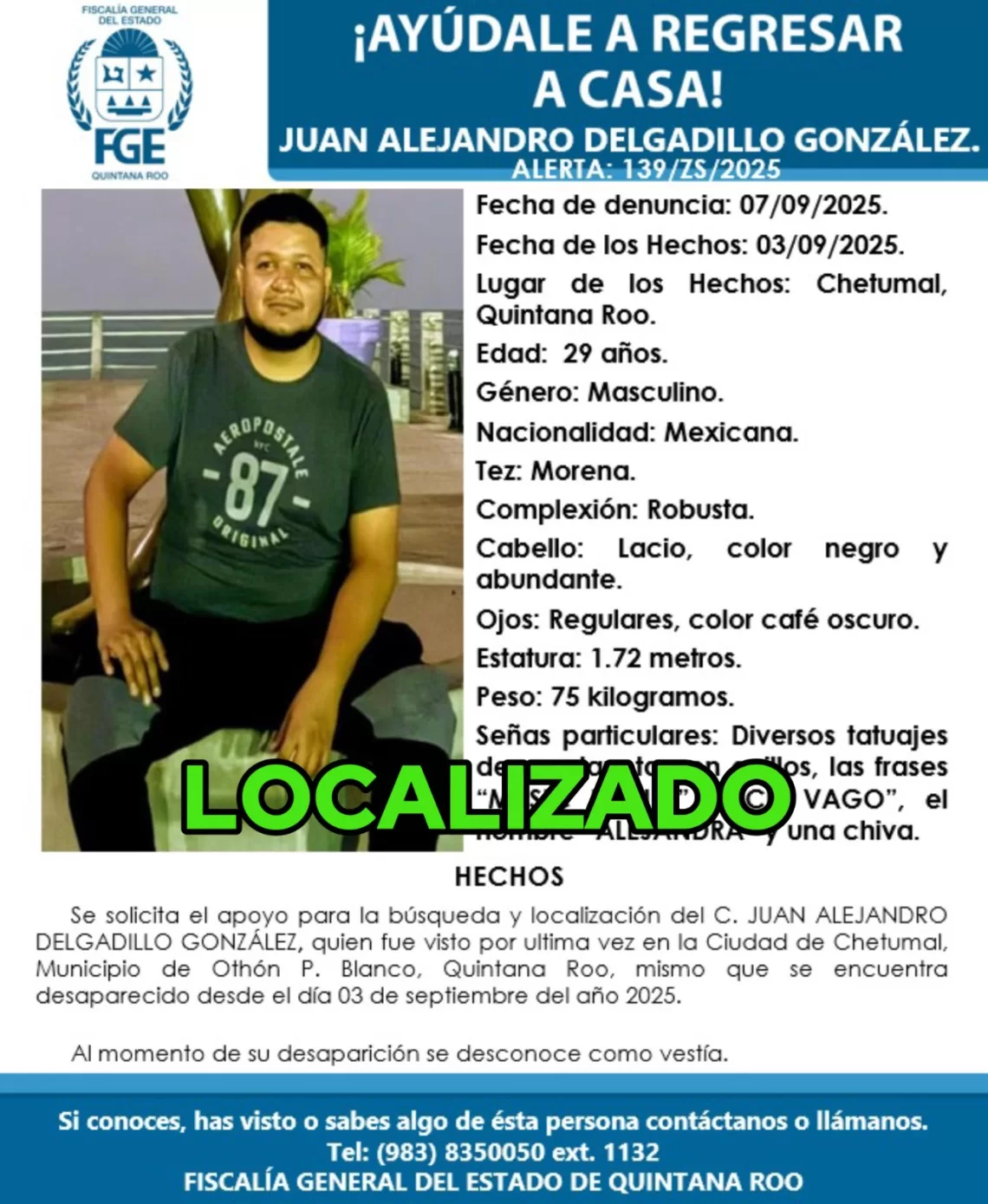 Chetumal, 28 de octubre (InZoom.Mx).– La Fiscalía General del Estado de Quintana Roo informó que fueron localizados con vida tres hombres originarios de Nayarit, reportados como desaparecidos desde el 3 de septiembre.