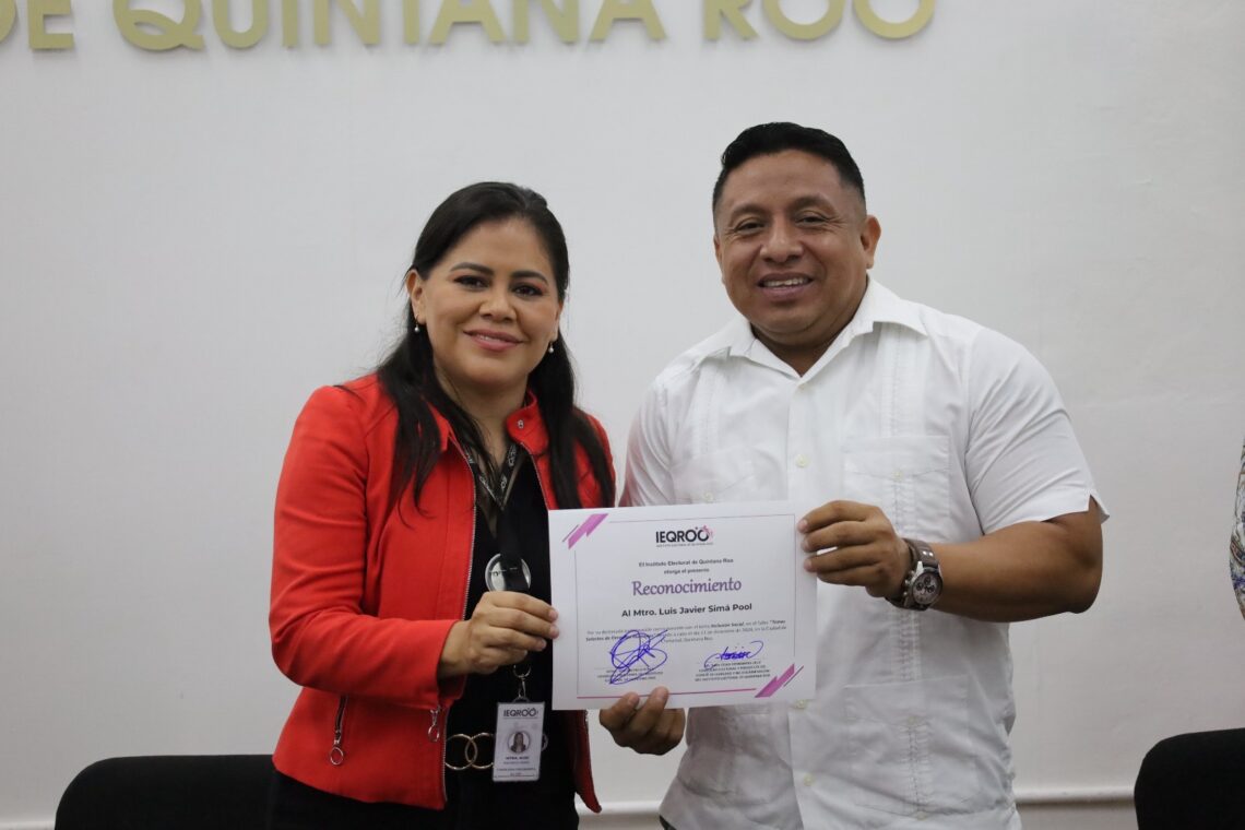 La Consejera Presidenta del IEQROO, Rubí Pacheco Pérez, entregó un reconocimiento al ponente Luis Javier Simá Pool por su destacada participación en el manejo de los diversos talleres que brindó al funcionariado electoral, por su parte, el Consejero Electoral y Presidente de la Comisión de Igualdad y No discriminación, Juan César Hernández Cruz hizo lo propio, con la compañera María Crescencia Estela González Barcelata.