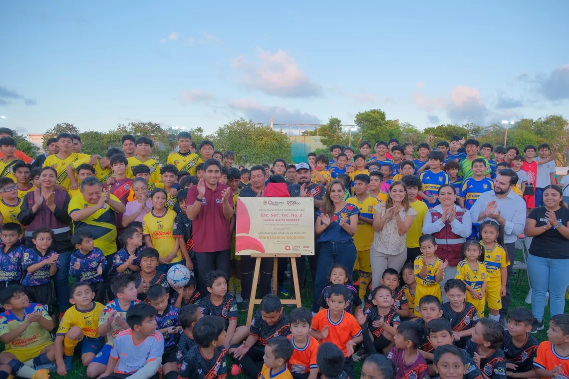 Chetumal.- Al entregar el campo de fútbol de la Escuela Secundaria Técnica No. 2 “Justo Sierra Méndez”, una institución de 61 años de historia en Chetumal, la gobernadora Mara Lezama Espinosa expresó que cada cancha rehabilitada, cada campo entregado, cada unidad deportiva rehabilitada es una batalla que ganamos las y los quintanarroenses en pro de la construcción de la paz.