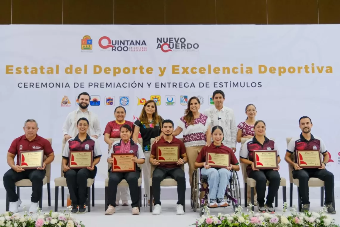 En el Centro Internacional de Negocios y Convenciones de Chetumal, Mara Lezama entregó reconocimientos a los ganadores del Premio Estatal del Deporte 2025: Andrés Dupont Cabrera, en la categoría de Deportista Convencional; Lya Daniela Sánchez Tadeo, Deportista Adaptado; Carlos Alberto Matos Zavala, entrenador de Levantamiento de Pesas; Yasmín Hernández Varela, entrenadora de Paradanza Deportiva; y la profesora Georgina Tatiana Roque Roque, Fomento Deportivo.