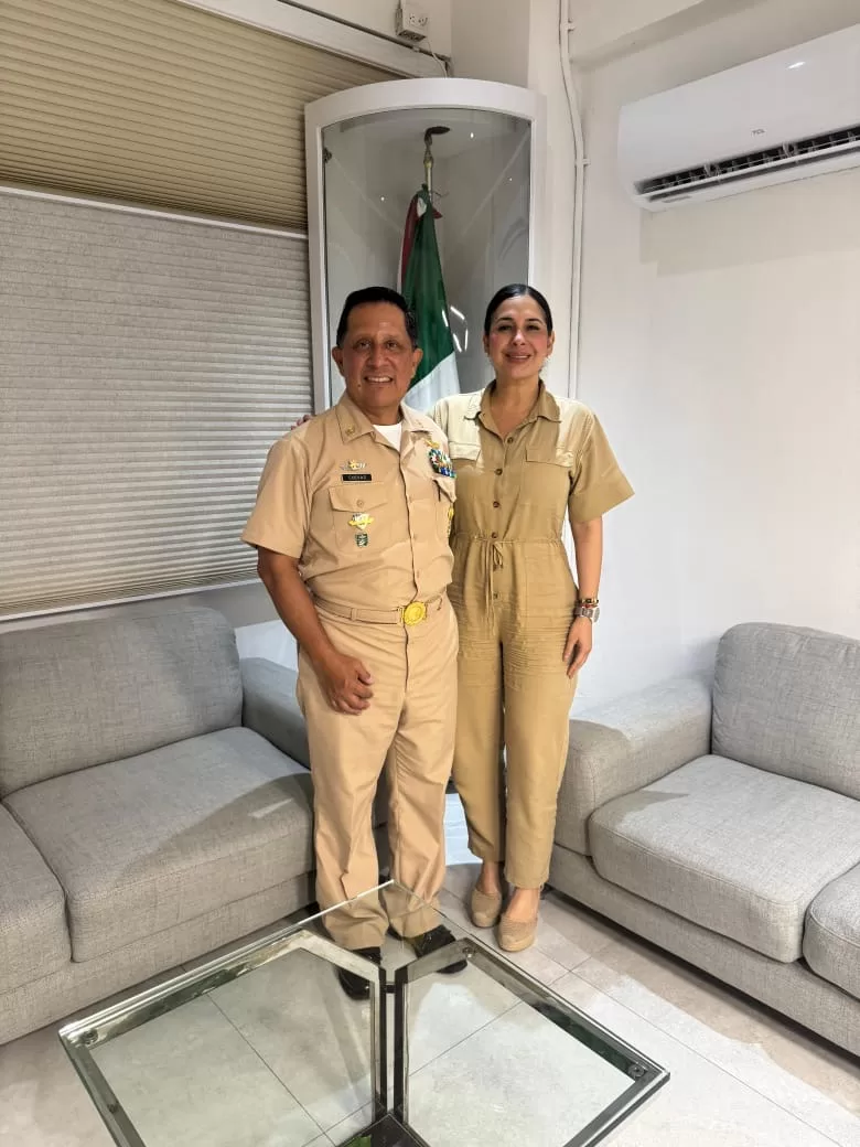 Playa del Carmen, Quintana Roo, 13 de mayo del 2025 . — La presidenta municipal de Playa del Carmen, Estefanía Mercado, sostuvo una reunión de trabajo con el Contraalmirante Cuerpo General Piloto Aviador José Alberto Rodríguez Cuevas, Comandante del Sector Naval, con el objetivo de fortalecer la coordinación en materia de seguridad y revisar los avances del trabajo que realiza la Secretaría de Marina en la limpieza del sargazo en las playas del municipio.