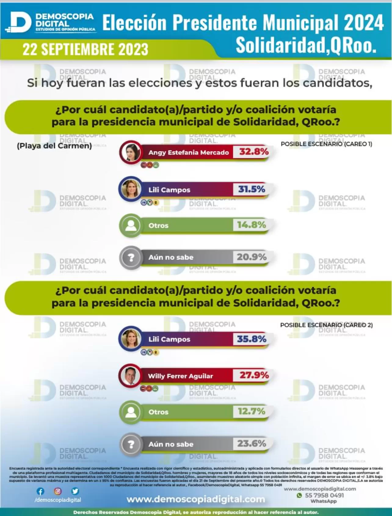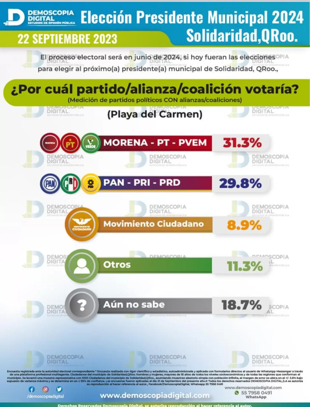 En la encuesta de preferencias electorales del municipio de Solidaridad, Quintana Roo (Playa del Carmen), Rumbo al 2024, Demoscopía Digital coloca a Morena como partido político en primer lugar con un 24.7% de los puntos porcentuales, por encima del PAN, que alcanza el 23.8%, y en tercer lugar MC con 8.2 puntos.