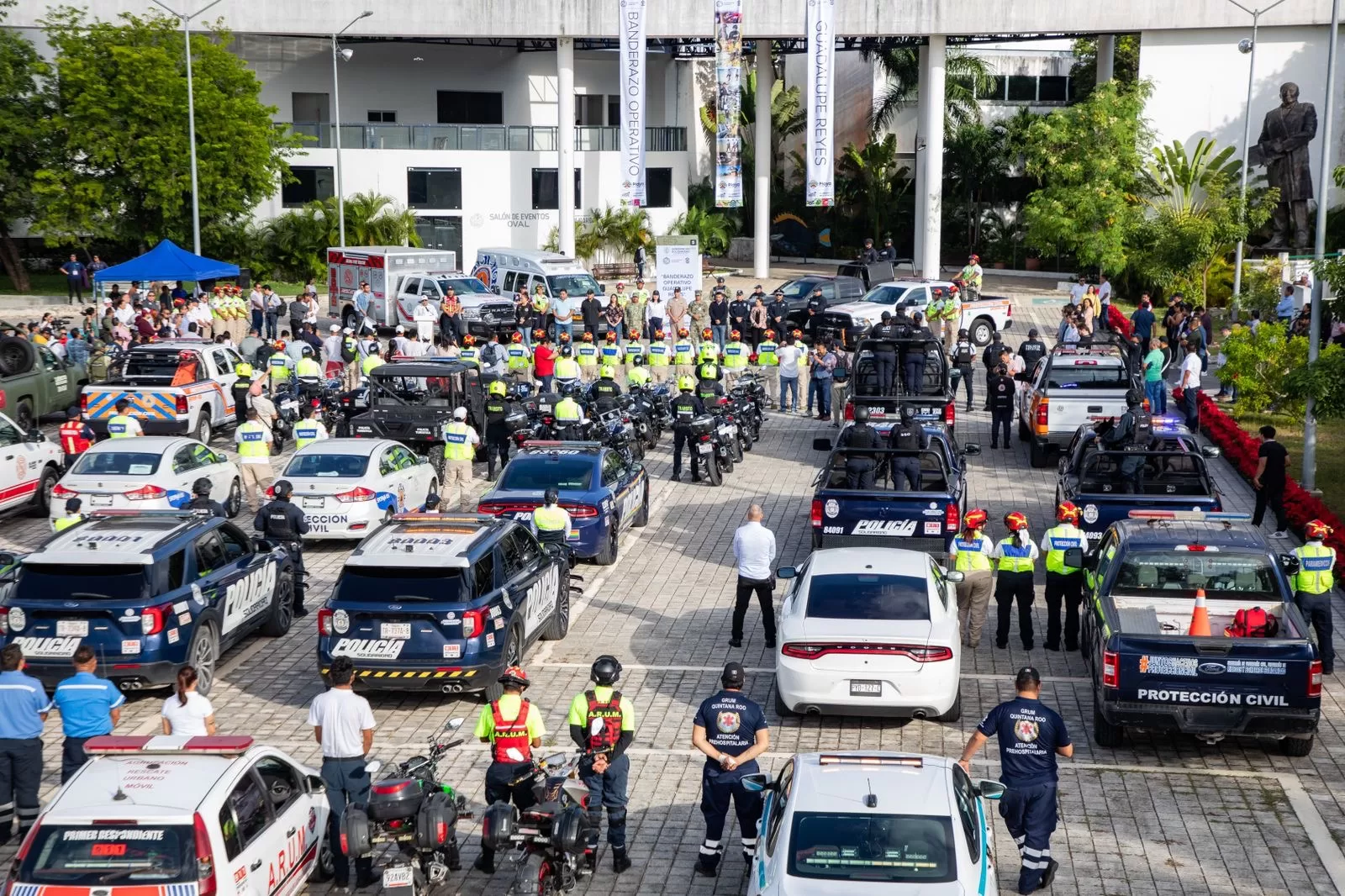 En la explanada del nuevo Palacio Municipal, de donde salieron las brigadas a bordo de motopatrullas, patrullas, ambulancias y vehículos militares, la Alcaldesa reafirmó que en Solidaridad la construcción de paz no es un ideal lejano, sino una meta posible que se logra con trabajo conjunto.