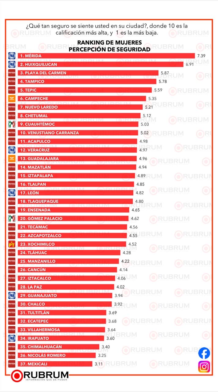 PLAYA DEL CARMEN, 9 de julio. — De acuerdo con el más reciente ranking nacional de percepción de seguridad realizado por la encuestadora Rubrum, el municipio de Playa del Carmen, se ubicó en el cuarto lugar nacional y en el tercero entre municipios encabezados por mujeres.