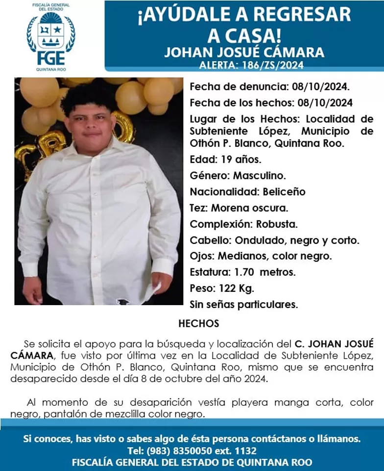 Chetumal, 9 de octubre (Infoqroo).- Una familia de Louisville Village, en el distrito de Orange Walk, Belice, aguarda con angustia noticias sobre el paradero de dos de sus seres queridos, Johan Josué Cámara y su padre Louis Josué Cámara, quienes fueron secuestrados anoche en Quintana Roo.