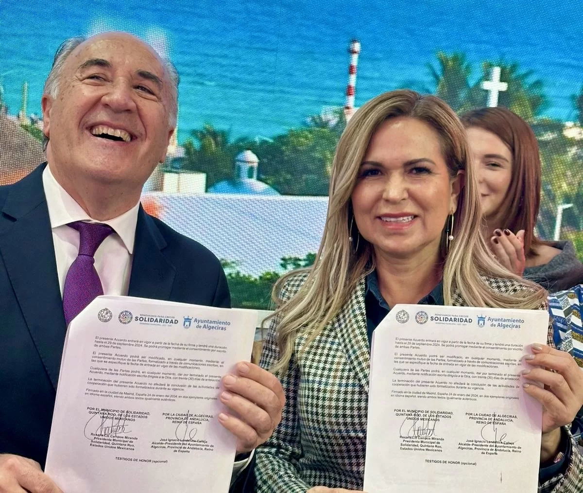 MADRID, 24 de enero.— La presidenta municipal de Solidaridad, Lili Campos, y el alcalde  de Algeciras, José Ignacio Landaluce Calleja, firmaron el primer hermanamiento internacional oficial entre los ayuntamientos de Solidaridad y Algeciras, provincia de Andalucía.