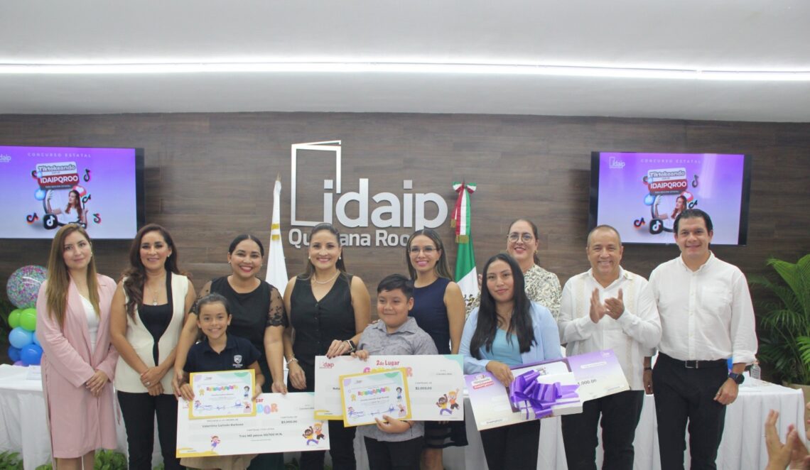 Chetumal a 03 de septiembre.- El Instituto de Acceso a la Información y Protección de Datos Personales de Quintana Roo (IDAIPQROO) premió a los ganadores del concurso estatal “Comisionada y Comisionado Infantil 2024”, así como del certamen “Tiktokeando con el IDAIPQROO”.