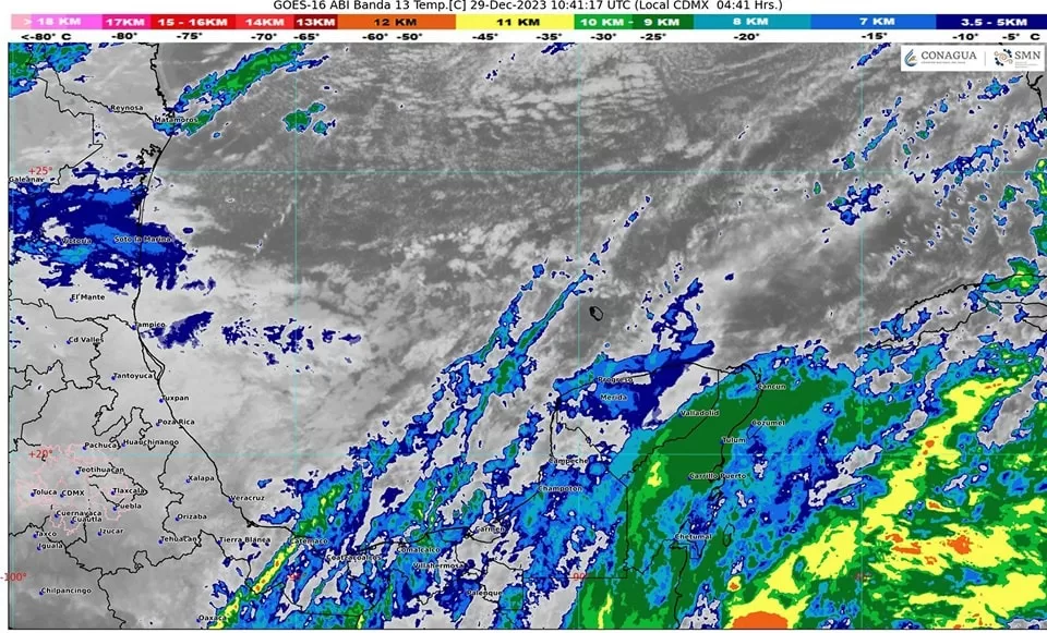 Este sistema frontal, al avanzar hacia el sur y sureste, interactúa con la corriente en chorro subtropical, provocando una extensa área de nublados y lluvias moderadas a fuertes en la Península de Yucatán.