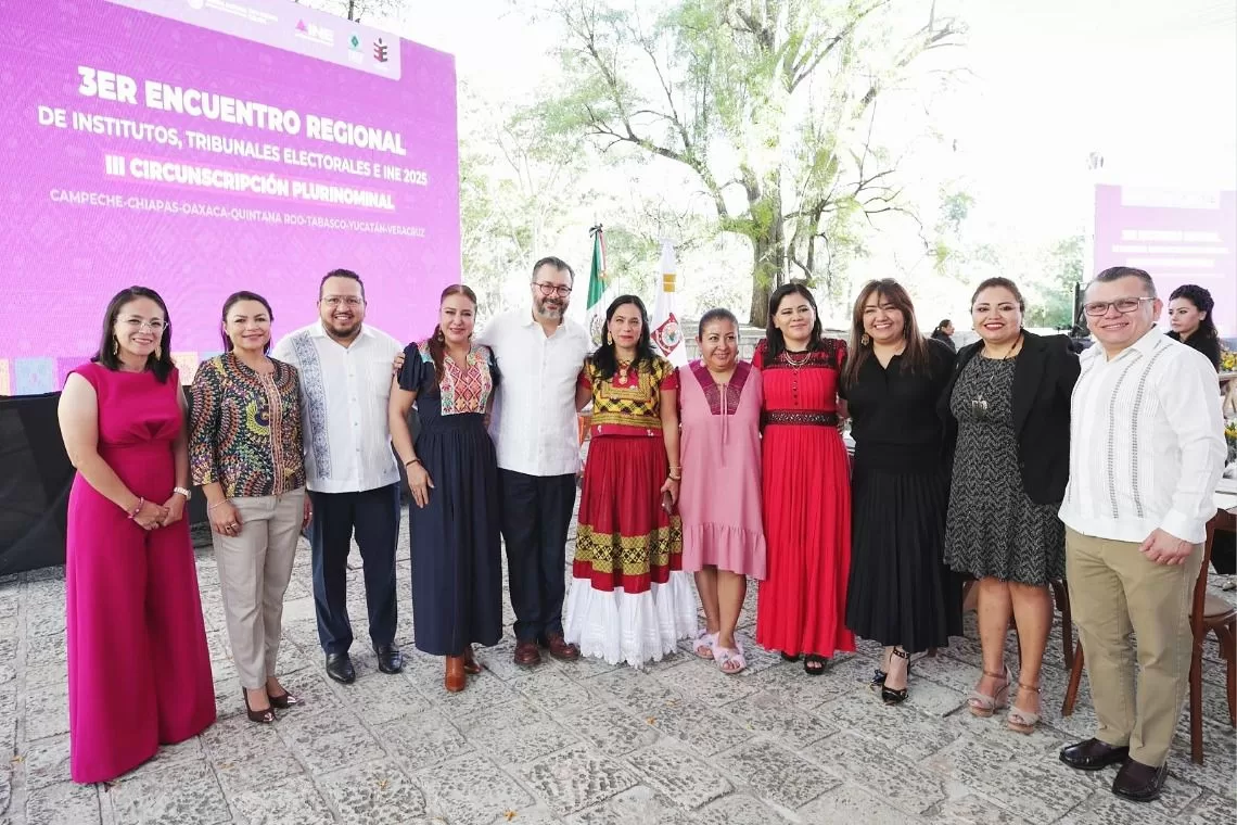 OAXACA, 27 de noviembre.— La consejera presidenta del Instituto Electoral de Quintana Roo (IEQROO), Rubí Pacheco Pérez, junto con las consejerías María Salomé Medina Montaño, Nora Leticia Cerón González, Patricia Cortés Pastrana, Maisie Lorena Contreras Briceño y Julio Asrael González Carrillo, acudieron al “3° Encuentro Regional de Institutos, Tribunales Electorales e INE 2025 en la III Circunscripción Plurinominal”, convocado por la Sala Regional Xalapa del Tribunal Electoral del Poder Judicial de la Federación (TEPJF).