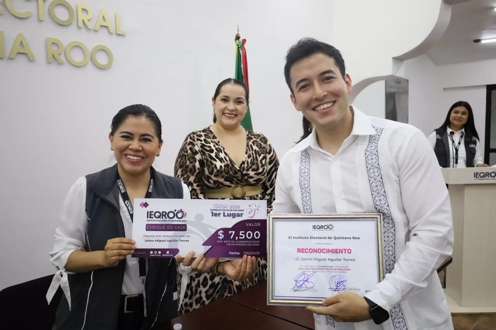 Chetumal, Quintana Roo; a 18 de marzo. – Con el objetivo de fomentar la reflexión activa de la juventud sobre los valores fundamentales de la democracia, el Instituto Electoral de Quintana Roo (IEQROO), a través de la Comisión de Comunicación Social realizó la ceremonia de premiación del concurso de TikTok 2025 “Exprésate con valor Challenge”.