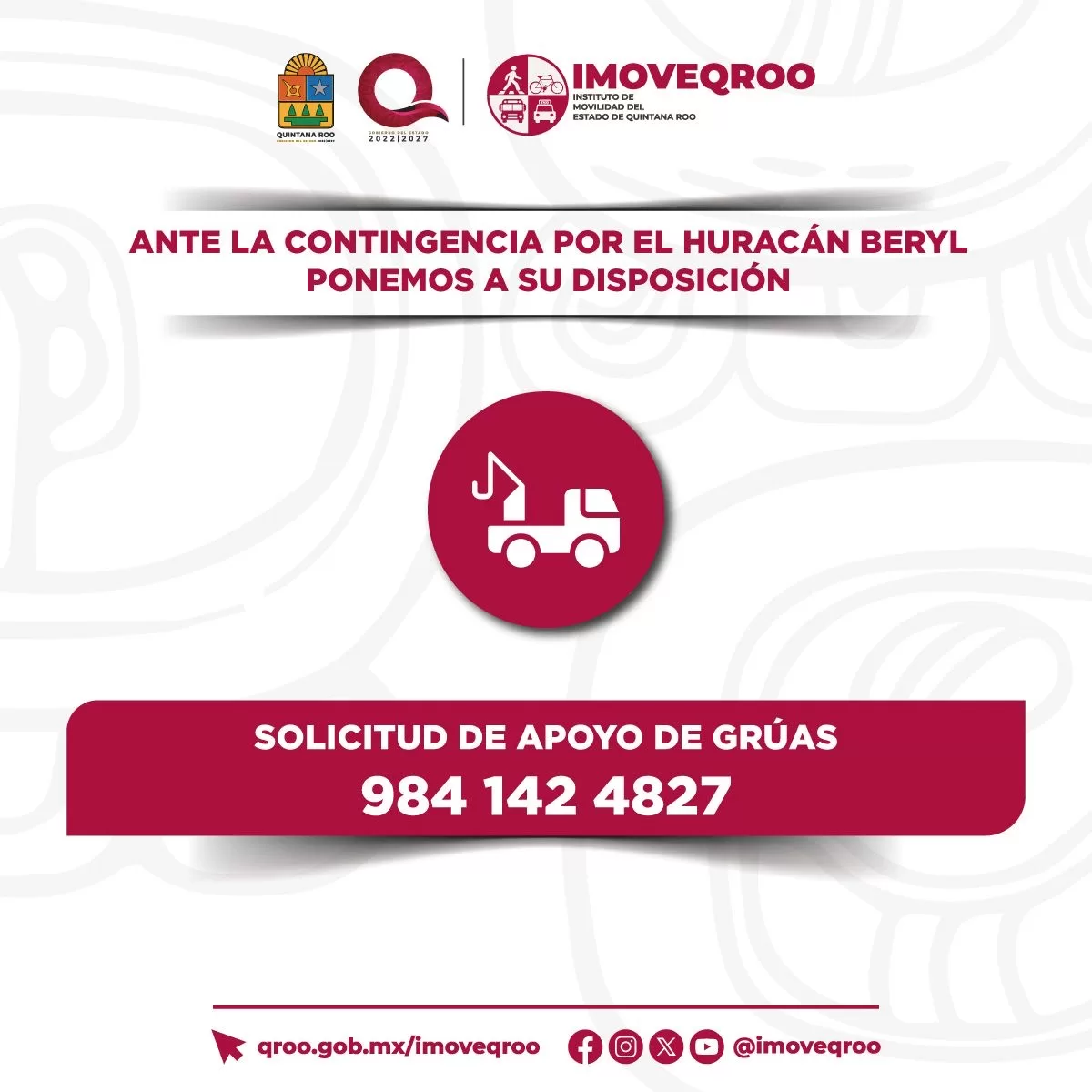 Cancún. – El Instituto de Movilidad de Quintana Roo (IMOVEQROO) informa a la ciudadanía que activa de manera permanente dos números de atención al público para apoyo a conductores de vehículos, combis, camiones y todo transporte terrestre que requiera de grúas para trasladarlos a zonas secas ante posibles encharcamientos y anegaciones.