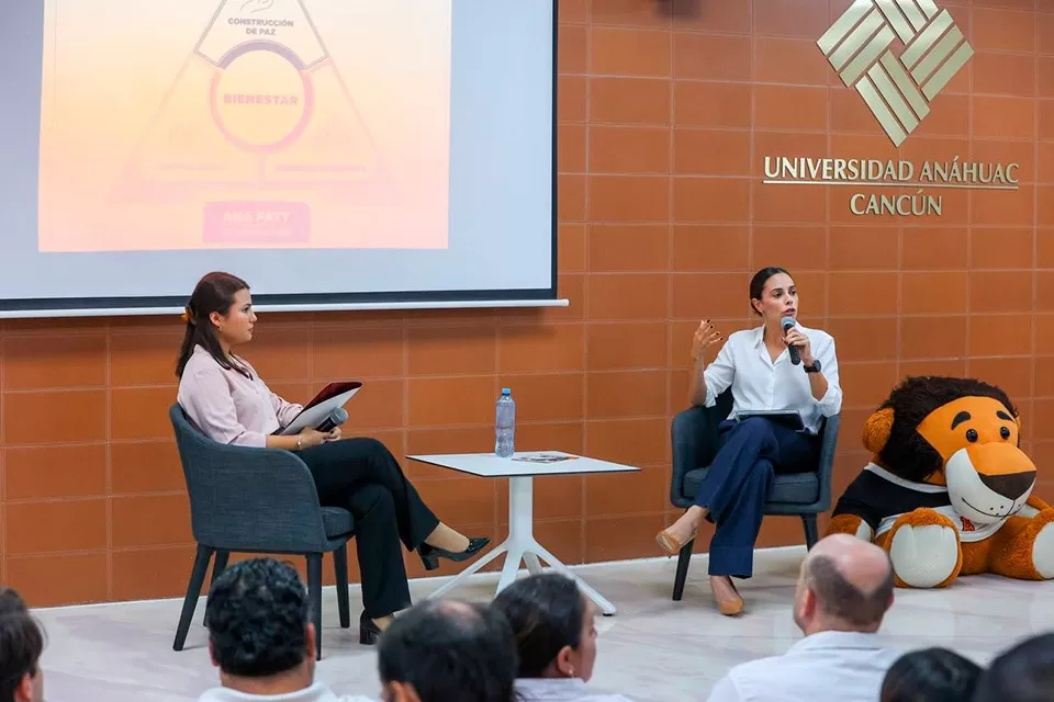 En atenciòn a una invitación a participar en el encuentro titulado “Diálogos por Cancún”, organizada por el alumnado de la Universidad Anáhuac Cancún, la abanderada de la coalición “Sigamos Haciendo Historia” se sumó a una charla interactiva con los estudiantes, señalando que por medio de sus tres ejes de gobierno: Construcción de Paz, Justicia Social y Gobierno Humanista, junto a los principios de la Cuarta Transformación, se promoverán estrategias y acciones dirigidas al bienestar de la comunidad, por lo que los invitó a ser líderes de acción positiva, corresponsables con la sociedad y su entorno.