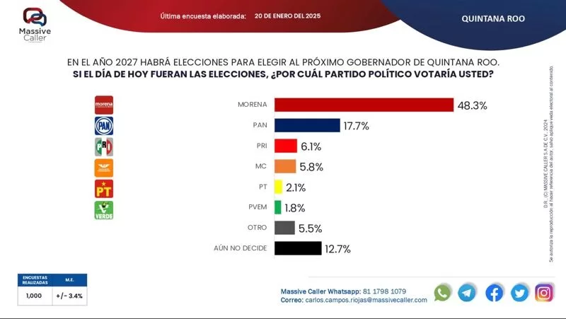 CANCÚN, 21 de enero.— La encuestadora Massive Caller, conocida por su historial controvertido y desaciertos en elecciones pasadas, dio a conocer el lunes lun dudoso sondeo rumbo a la sucesión gubernamental de 2027 en Quintana Roo.