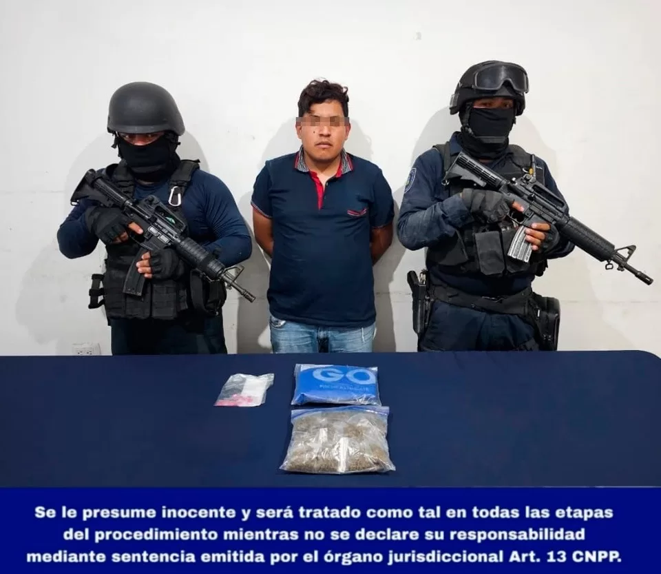 Ante el hecho, se procedió a la revisión correspondiente en la que se le aseguraron: 30 dosis de marihuana y 15 pastillas psicotrópicas. El detenido identificado como Diego “N”, (a) “El Moreno”, de 23 años, fue llevado a las instalaciones de la Fiscalía General del Estado para la puesta a disposición e investigaciones correspondientes.