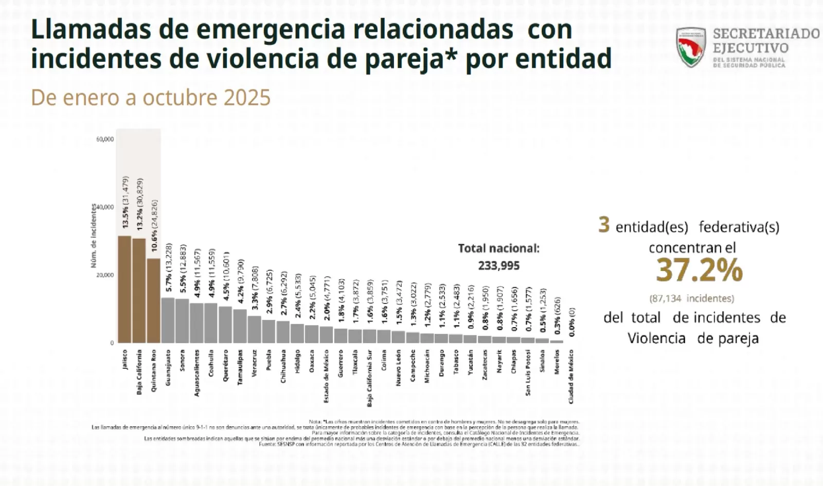 Por ejemplo, Quintana Roo está dentro de las tres entidades federativas que acumulan el 37.2 por ciento de los delitos relacionados con incidentes de violencia de pareja. De enero a octubre, el primer lugar lo tiene Jalisco, con 13.5 por ciento; el segundo, Baja California, con 13.2 por ciento; y le sigue Quintana Roo, con el 10.6 por ciento.