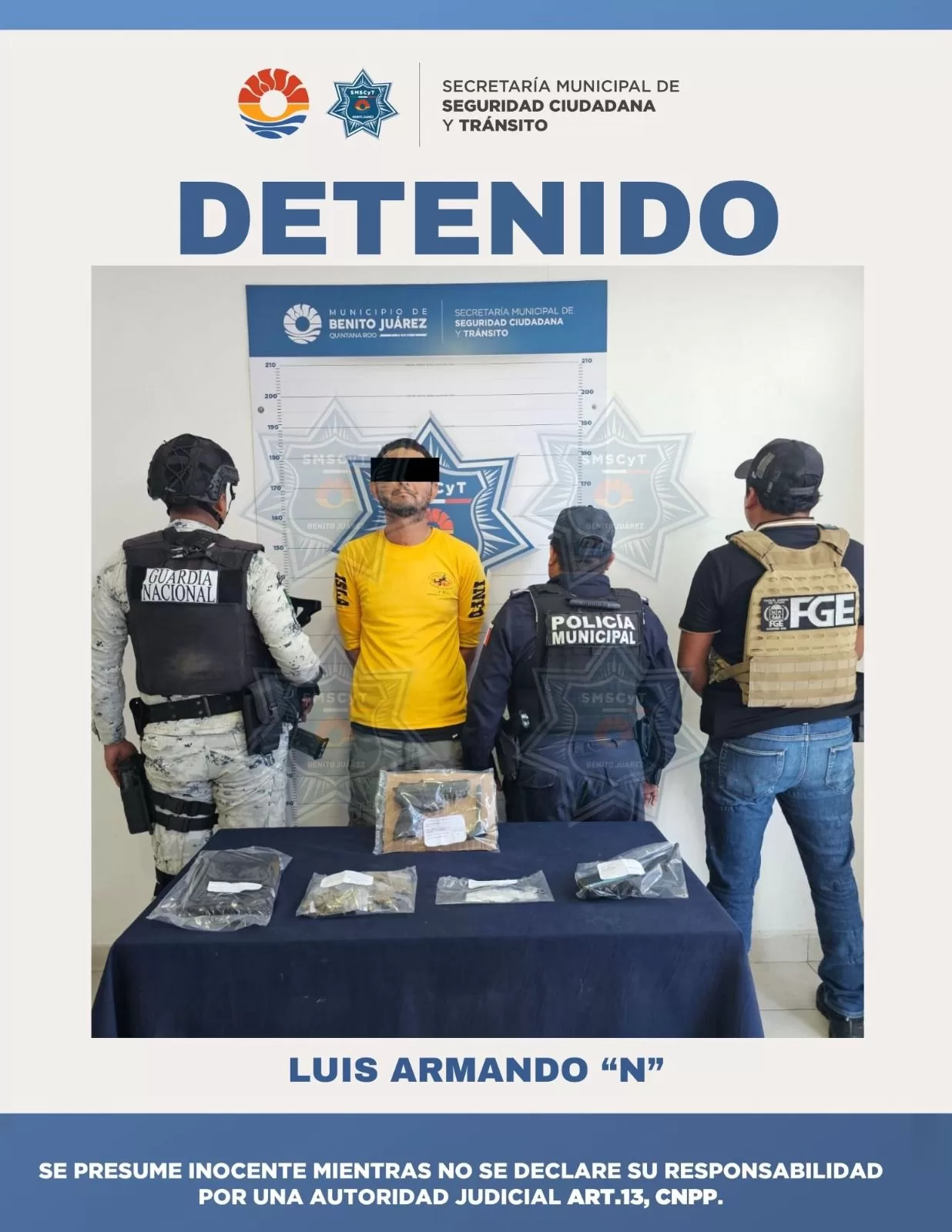 Cancún, 27 de agosto (InZoom.mx).– En una acción coordinada entre la Guardia Nacional, Fiscalía General del Estado (FGE) y la Secretaría Municipal de Seguridad Ciudadana y Tránsito (SMSCyT) de Benito Juárez, fue detenido un hombre por su presunta participación en delitos contra la salud, en la modalidad de narcomenudeo.