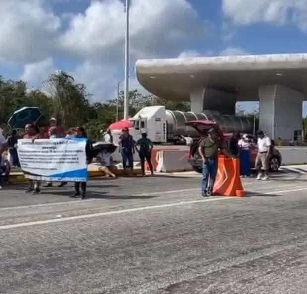 Cancún, Q. Roo, 3 de abril de 2025. — Un grupo de profesores mantienen tomada la caseta de cobro ubicada en El Tintal de la autopista Mérida–Cancún, como parte de una jornada de protesta en la que exigen la derogación de la Ley del ISSSTE 2007 y “respuestas inmediatas” a sus demandas por parte del gobierno federal.