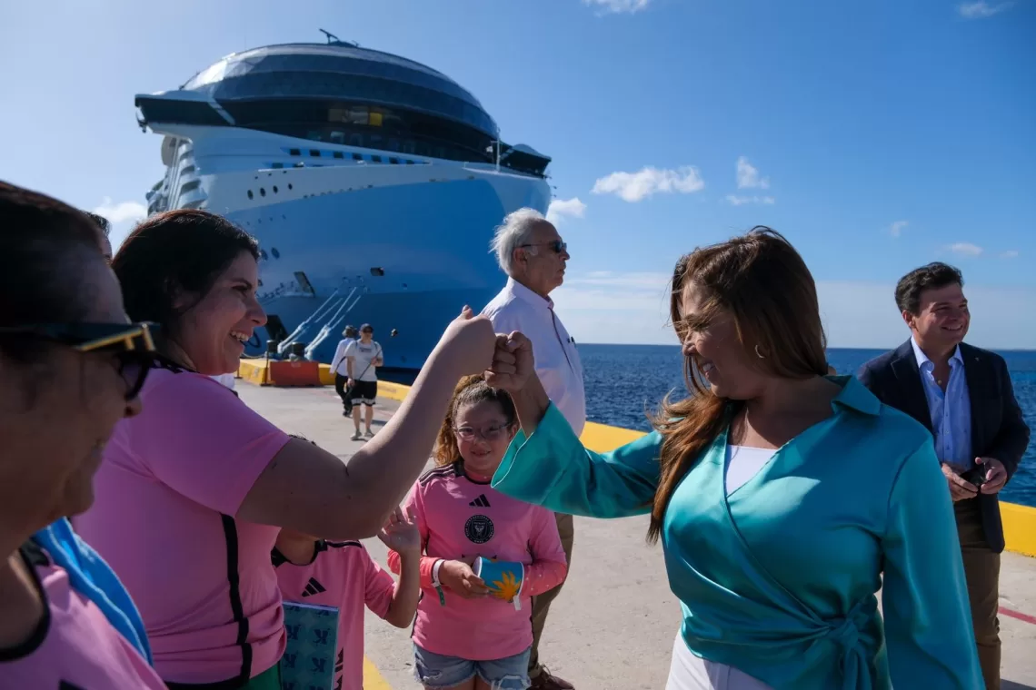 MAHAHUAL, 6 de febrero.- La gobernadora Mara Lezama Espinosa recibió en el muelle Grand Costa Maya de Mahahual al crucero más grande del mundo, el Icon of the Seas de la Royal Caribbean, que llegó esta mañana procedente de Miami en su viaje inaugural.