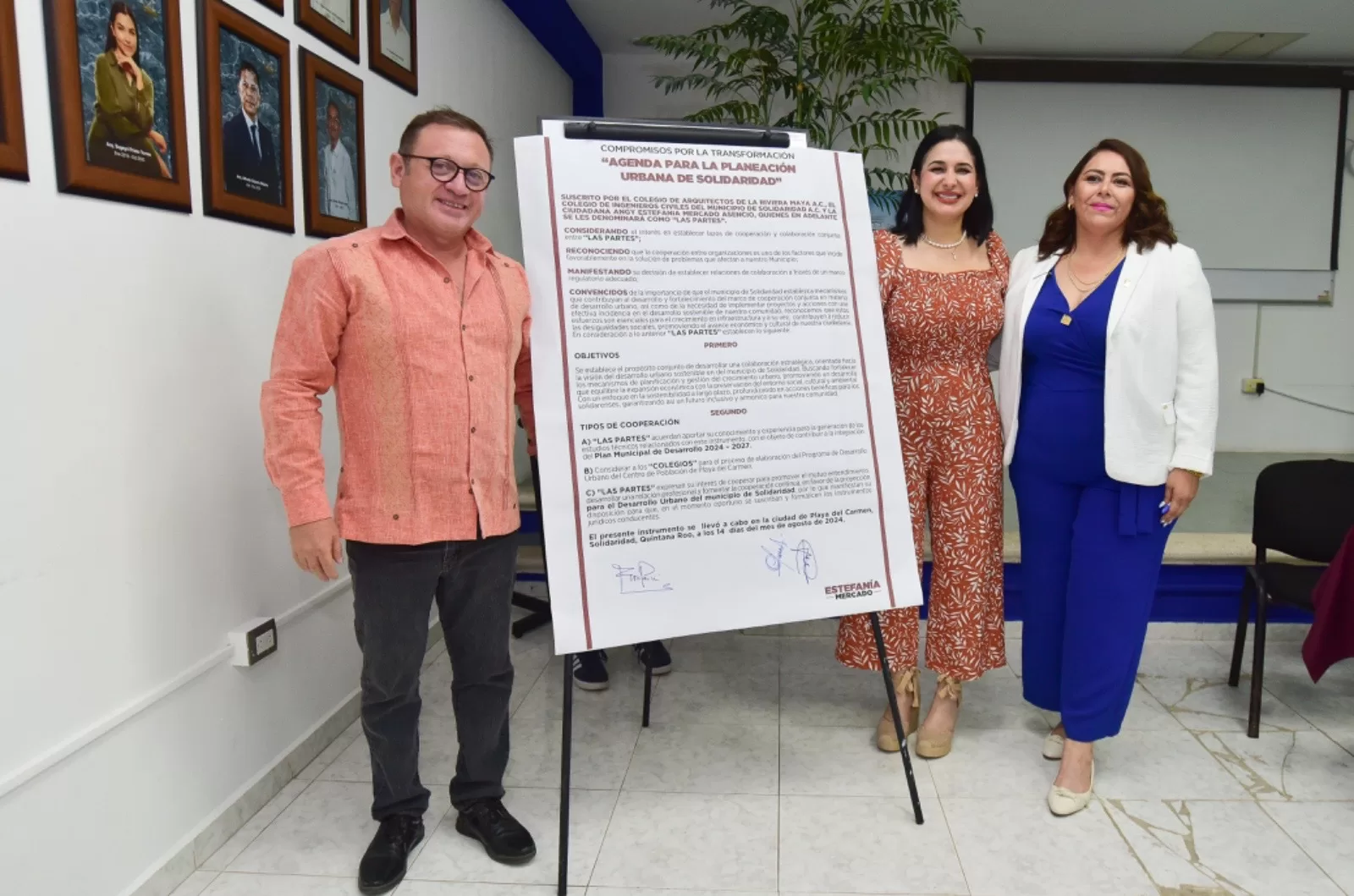 Playa del Carmen, Quintana Roo, 15 de agosto de 2024.— Con el objetivo de establecer una colaboración estratégica para la construcción del Plan Municipal de Desarrollo 2024-2027, la presidenta municipal electa de Solidaridad, Estefanía Mercado, firmó con los colegios de Arquitectos y de Ingenieros la “Agenda para la Planeación Urbana de Solidaridad”.