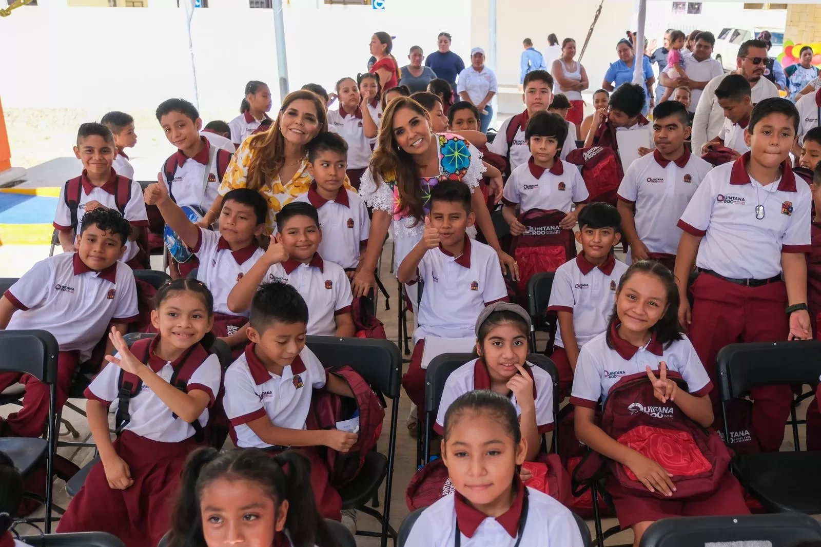 En el preescolar “Tumben Ka’an”, hasta donde acudieron las alumnas y alumnos de la escuela primaria de nueva creación “Miguel Vidal Alcocer”, la Gobernadora entregó los primeros 345 uniformes, 345 mochilas y 207 paquetes de útiles escolares gratuitos.