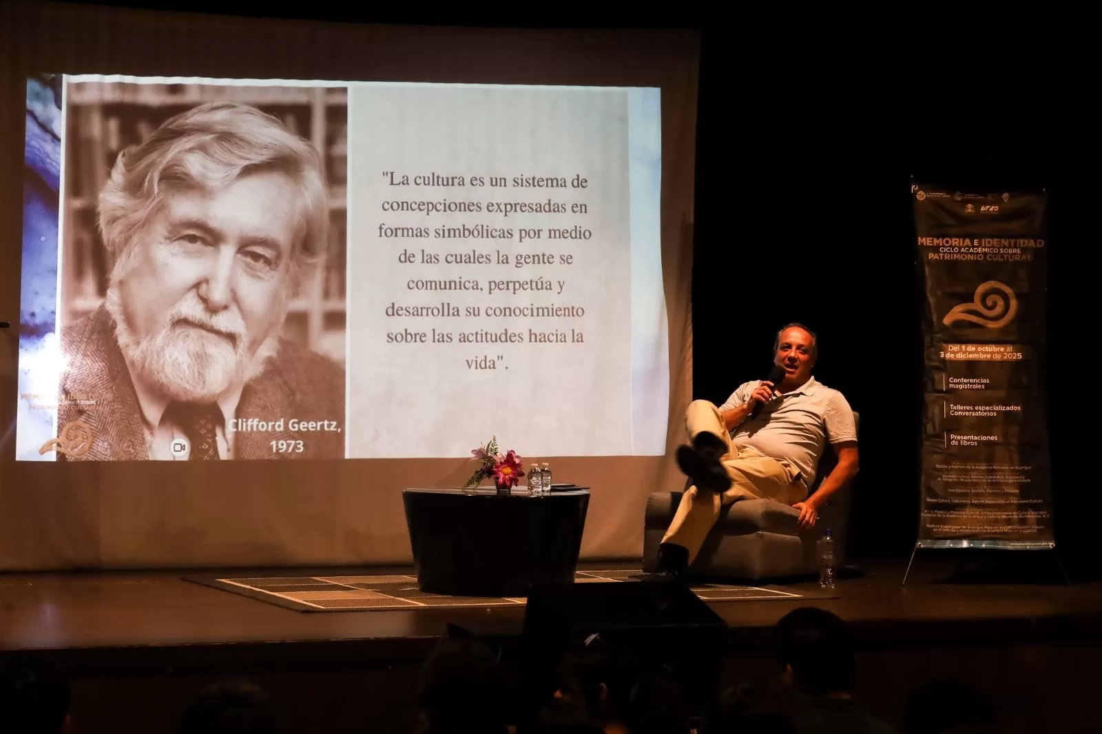 Playa del Carmen, Quintana Roo, 30 de octubre de 2025.- El programa “Memoria e Identidad. Ciclo académico sobre Patrimonio Cultural” del Instituto Municipal de la Cultura y las Artes de Playa del Carmen, presentó el taller “Conciencia Cultural” del Doctor Rafael Osorio Rivera, en la Sala de Convenciones de la Universidad Autónoma del Estado de Quintana Roo (Uqroo) y en el Foro Cultural, frente al estudiantado de las Universidad Tecnológica de la Riviera Maya, de la Universidad para el Bienestar Benito Juárez y de la misma Uqroo.