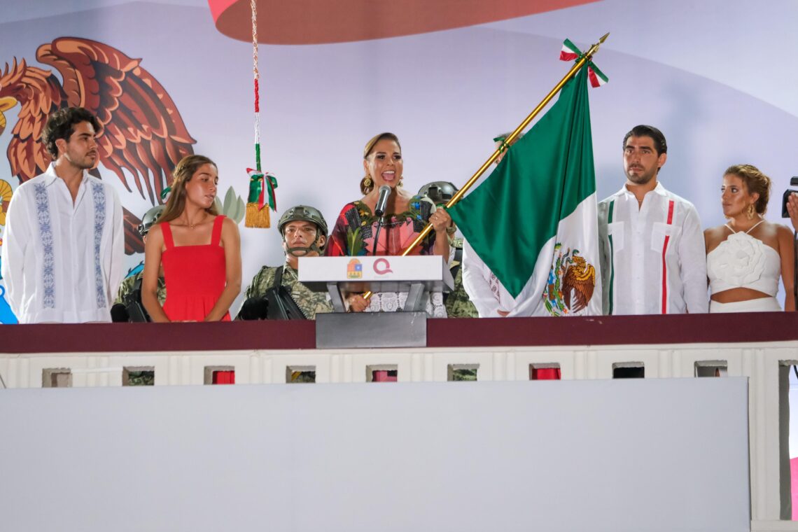 ¡Mexicanas y mexicanos!, ¡Quintanarroenses! ¡Viva la Independencia Nacional! ¡Vivan los héroes que nos dieron patria y libertad! ¡Viva Miguel Hidalgo! ¡Viva José María Morelos! ¡Viva Vicente Guerrero! ¡Viva Nicolás Bravo! ¡Viva Juan Aldama! ¡Viva Ignacio Allende! ¡Viva Mariano Matamoros! ¡Viva Andrés Quintana Roo! ¡Viva Josefa Ortiz de Domínguez! ¡Viva Leona Vicario! ¡Qué vivan las mujeres! ¡Qué viva el humanismo con corazón feminista! ¡Viva Quintana Roo! ¡Viva Quintana Roo! ¡Viva México! ¡Viva México! ¡Viva México!