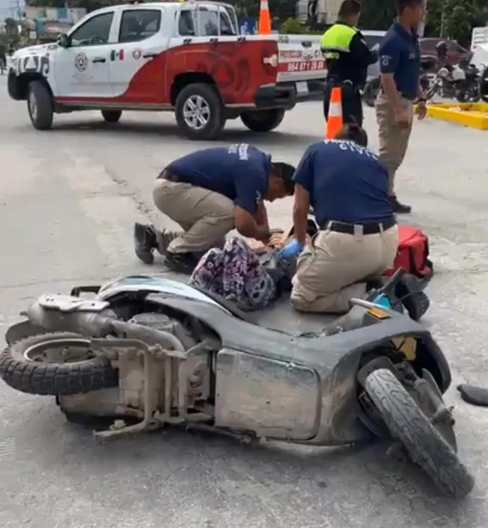 Tulum, 13 de diciembre (InZoom.mx).- La importancia de supervisar que menores de edad no conduzcan motocicletas quedó en evidencia tras un accidente ocurrido en el cruce de la avenida Tulum con la calle Géminis, que dejó a una adolescente lesionada.
