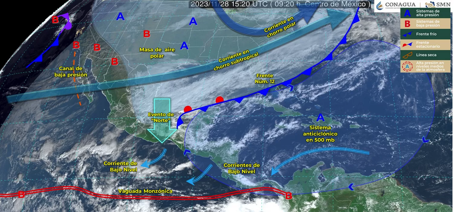 CIUDAD DE MÉXICO, 28 de noviembre. — Tras la incidencia de 12 frentes fríos en lo que va de la temporada 2023-2024, el Servicio Meteorológico Nacional (SMN) de la Comisión Nacional del Agua (Conagua) alerta sobre la llegada de un nuevo sistema frontal que se aproximará al territorio mexicano, intensificando las condiciones climáticas adversas.