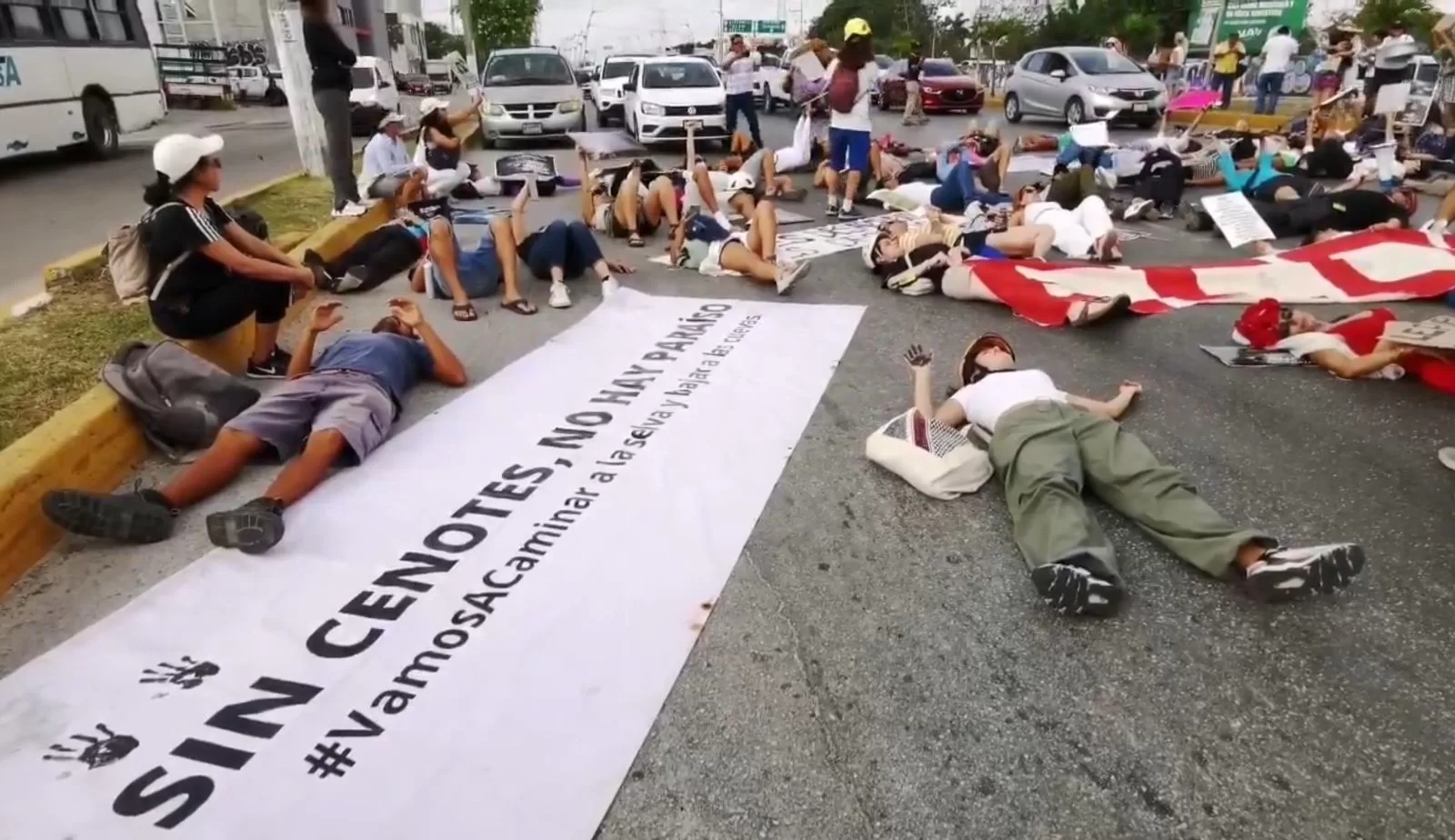 El cierre a la circulación se registró esta mañana a la altura de la estación del Tren Maya en la ciudad de Playa del Carmen y se realiza en el marco de la conmemoración del Día internacional del Agua y así llamar la atención sobre la contaminación del acuífero maya por las perforaciones hechas para instalar los pilotes que soportan las vías férrreas.