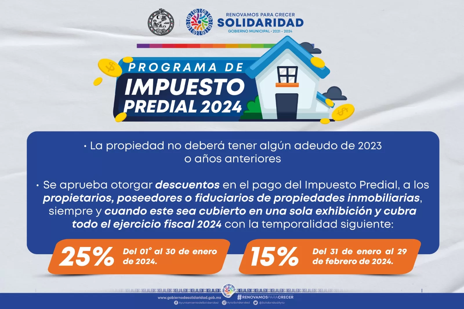 Playa del Carmen, Solidaridad, 28 de diciembre de 2023.- Para respaldar la economía y facilitar el cumplimiento de obligaciones tributarias de las y los solidarenses, la administración municipal dirigida por la presidenta Lili Campos otorga descuentos en el pago del impuesto predial 2024 a los propietarios, poseedores o fiduciarios de propiedades inmobiliarias, siempre y cuando el pago sea cubierto en una sola exhibición y se cubra todo el ejercicio fiscal del año.