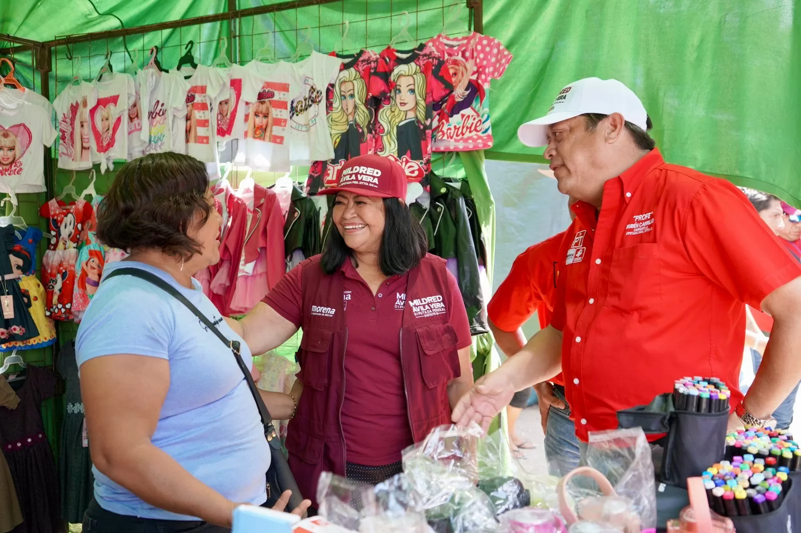 CANCÚN, 22 de abril.— Mildred Ávila Vera, candidata a diputada federal por el distrito 04 de la coalición “Sigamos haciendo historia”, recorrió hoy el tianguis de la región 104 junto con Rubén Carrillo, candidato a diputado por el distrito 03 local.