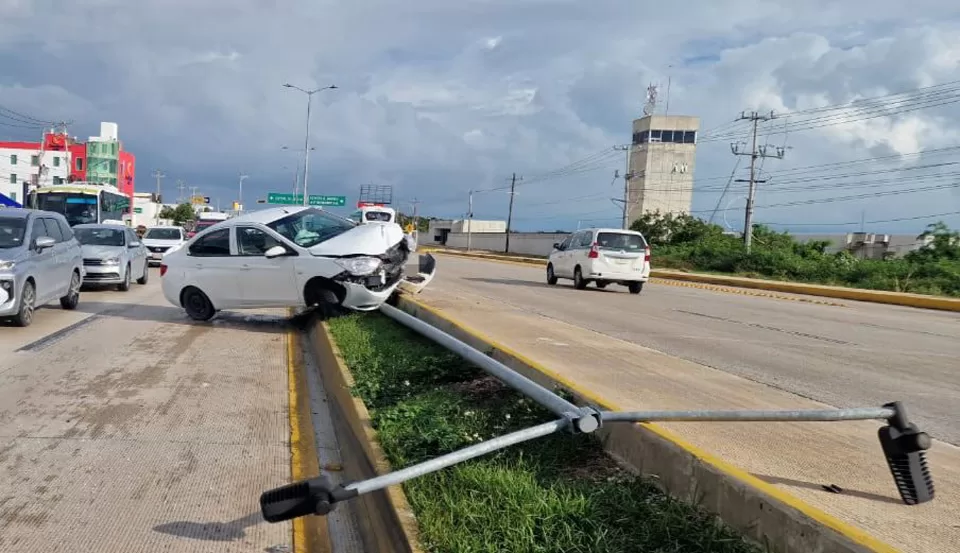 Minutros después, a las 9:44 se reportó otro percance, esta vez a la altura de la Carfix, en la supermanzana 299, donde el conductor de un Chevrolet Aveo de color blanco, perdió el control de su dirección, se subió al camellón central y derribó un poste del alumbrado público.