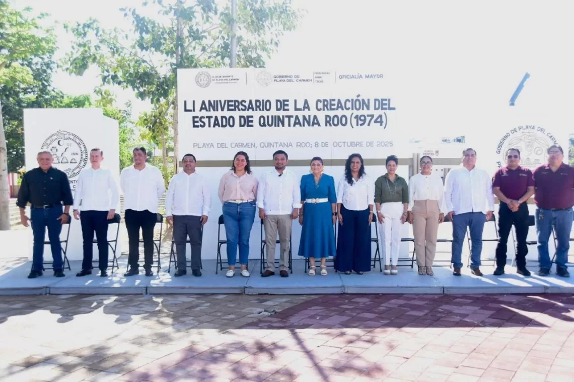 Playa del Carmen, Quintana Roo, 8 de octubre de 2025. – Con un acto cívico realizado en la Plaza 28 de Julio, el Ayuntamiento de Playa del Carmen conmemoró el 51 aniversario de la creación del Estado de Quintana Roo, resaltando la historia, fortaleza y desarrollo que han distinguido a la entidad a lo largo de más de cinco décadas.