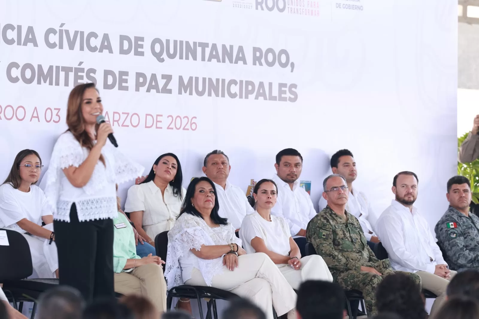Durante su intervención, la gobernadora Mara Lezama informó que Quintana Roo cuenta actualmente con mil 200 comités ciudadanos activos en todo el estado y anunció la meta de alcanzar 3 mil en los próximos dos meses, a fin de fortalecer la participación comunitaria como base para la construcción de paz.