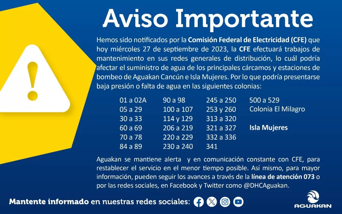 Aguakan se mantiene alerta y en comunicación constante con CFE, para restablecer el servicio en el menor tiempo posible.
