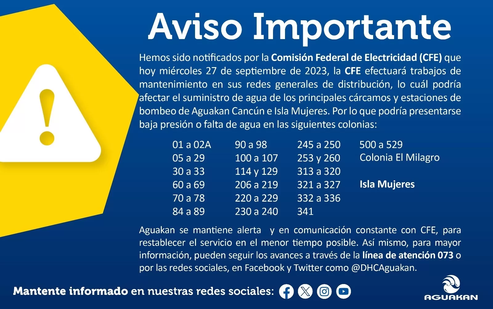 CANCÚN, 27 de septiembre.- La Comisión Federal de Electricidad (CFE) ha notificado que se encuentra realizando trabajos de mantenimiento a sus redes generales de distribución, interrumpiendo el suministro de energía en los cárcamos y pozos de la zona de Captación, por lo que el suministro de agua potable en Cancún
