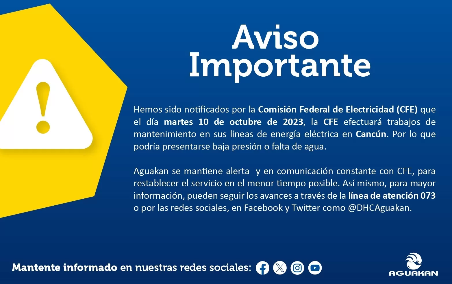 Aguakan se encuentra en alerta y en comunicación constante con CFE para restablecer el servicio en el menor tiempo posible. Es importante mencionar que después de la finalización de los trabajos, durante las siguientes 48 horas, podría haber una baja presión en las colonias mencionadas.