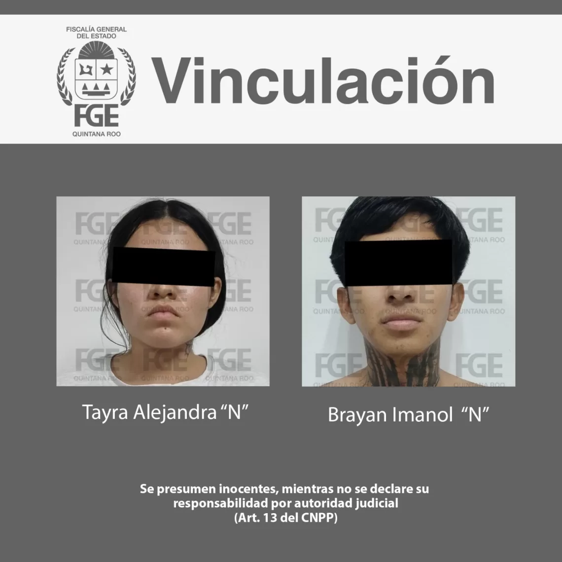 Cancún, 08 de enero (InZoomMX).— La Fiscalía General del Estado logró la vinculación a proceso de un hombre y una mujer, identificados como Brayan Imanol “N” y Tayra Alejandra “N”, por su presunta participación en el delito de feminicidio, cometido en perjuicio de una víctima cuya identidad se mantiene bajo reserva, en este municipio.