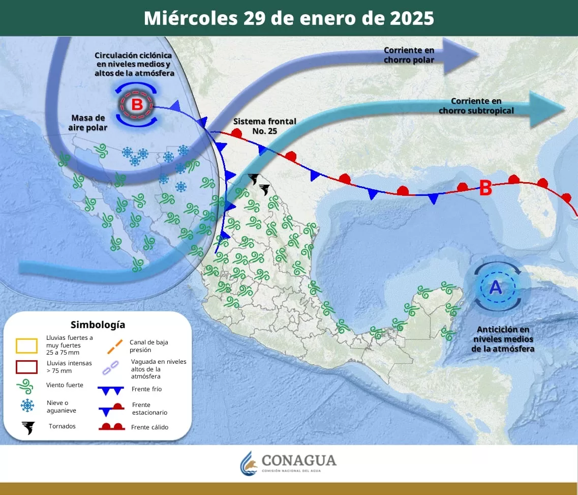Asimismo, el Frente frío No. 25 se desplazará sobre el norte de la República Mexicana, mientras que la masa de aire marítimo polar que lo impulsa cubrirá el noroeste del territorio nacional, ambos en interacción con una circulación ciclónica en niveles medios y altos de la atmósfera que se moverá sobre el suroeste de Estados Unidos y con las corrientes en chorro polar y subtropical, ocasionarán vientos fuertes a muy fuertes con posibles tolvaneras, lluvias y chubascos en el noroeste, norte y noreste del país, y con posible formación de torbellinos en Coahuila.