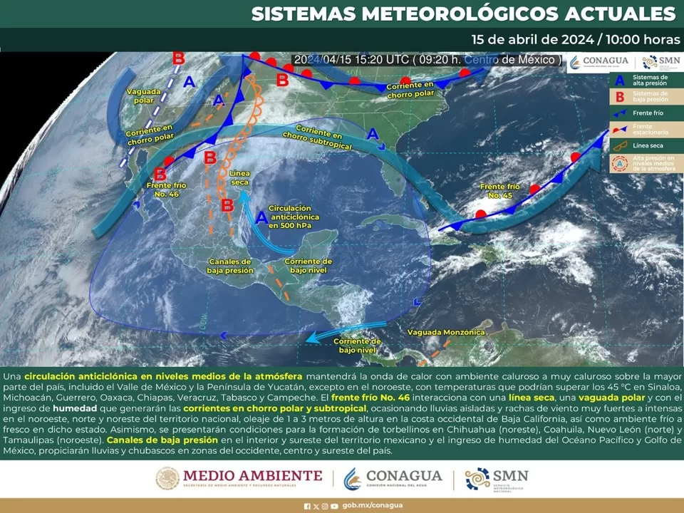 Cancún, 15 de abril (Infoqroo).– Una circulación anticiclónica localizada en niveles medios de la atmósfera mantendrá hoy la primera onda de calor sobre Quintana Roo, con temperaturas máximas diurnas de entre 35 y 40°C, cielo parcialmente nublado con incremento de nublados durante el día, poca probabilidad de lluvias, ambiente muy caluroso a bochornoso durante el día y cálido durante la madrugada y al amanecer.