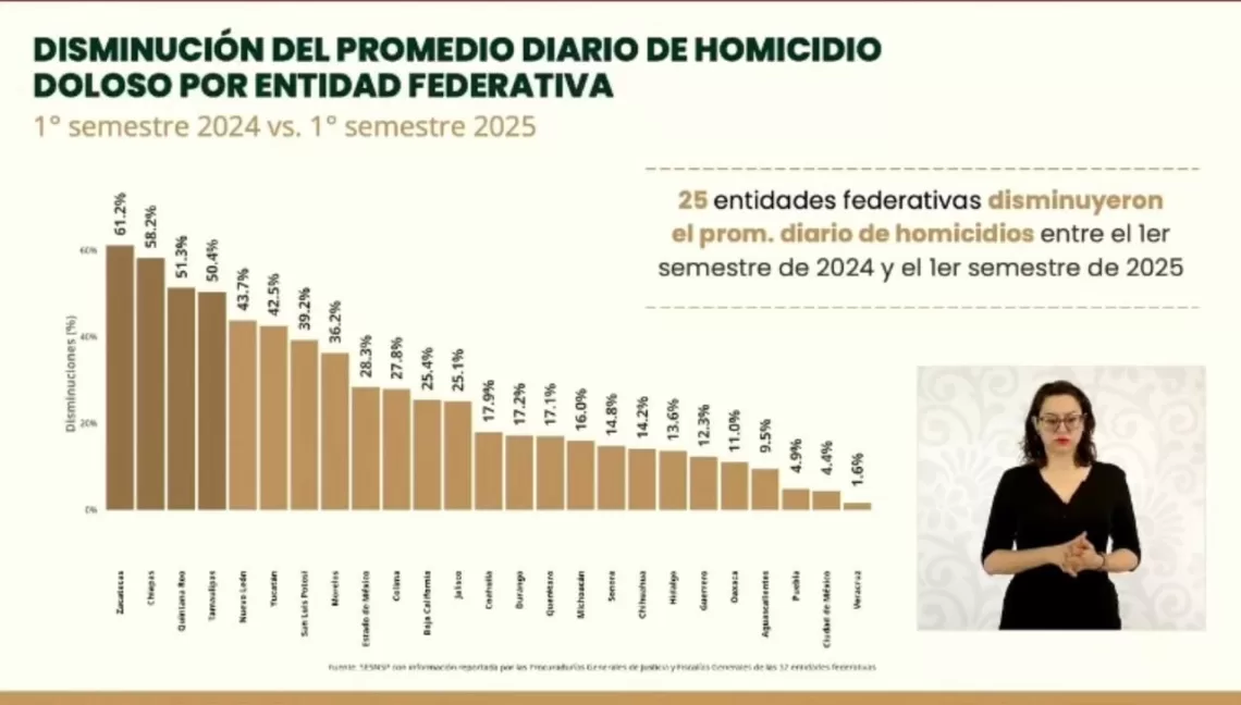 Durante la Conferencia del Pueblo de la Presidenta Claudia Sheinbaum, se presentaron los avances en seguridad del primer semestre de 2025, destacando logros importantes en la disminución de homicidios en diversas entidades federativas.