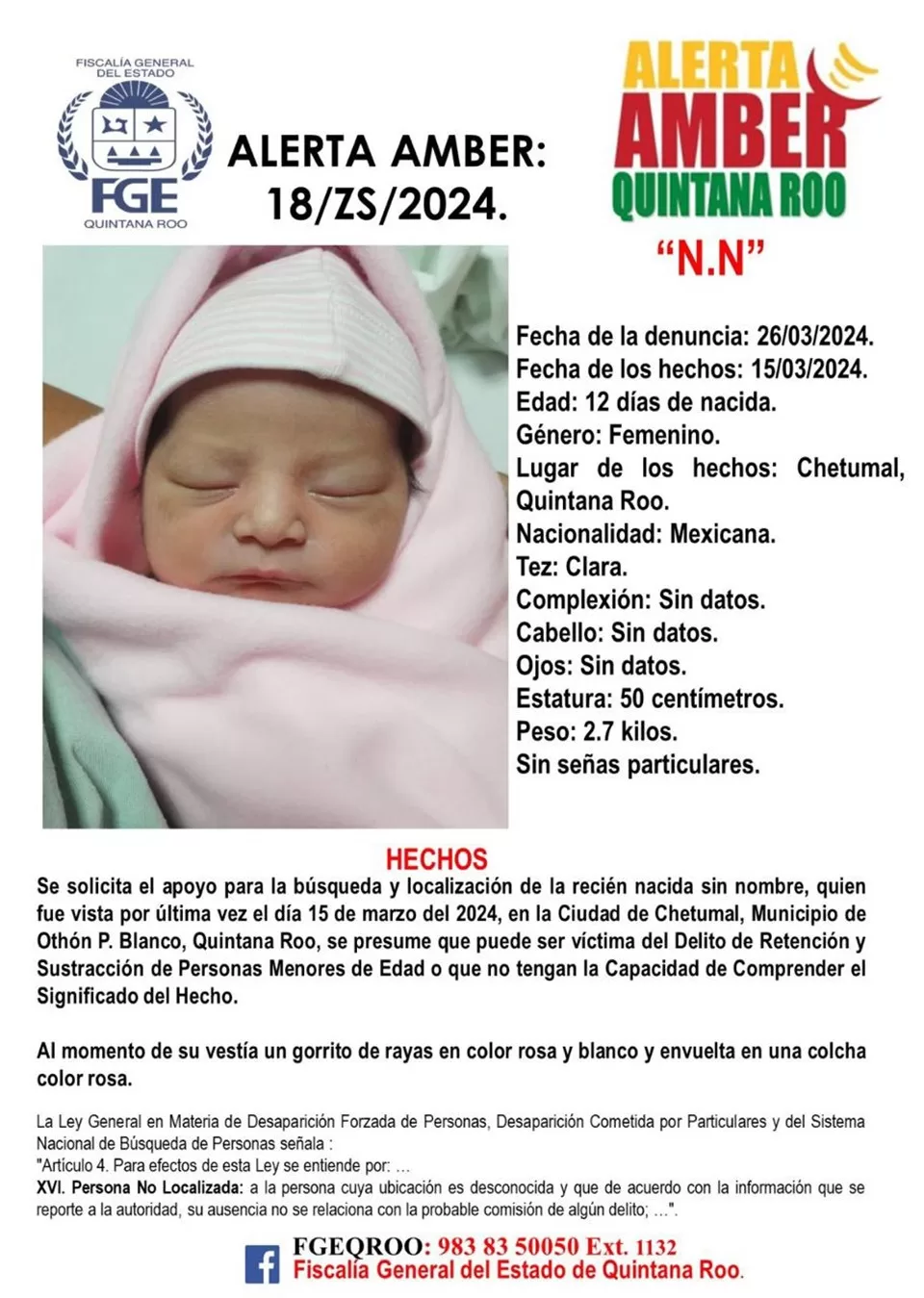 Chetumal, 27 de marzo (Infoqroo).- Autoridades del estado de Quintana Roo activaron esta mañana a través del mecanismo “Alerta Amber”, la búsqueda de una recién nacida de apenas 12 días, que al parecer fue robada en la ciudad de Chetumal.