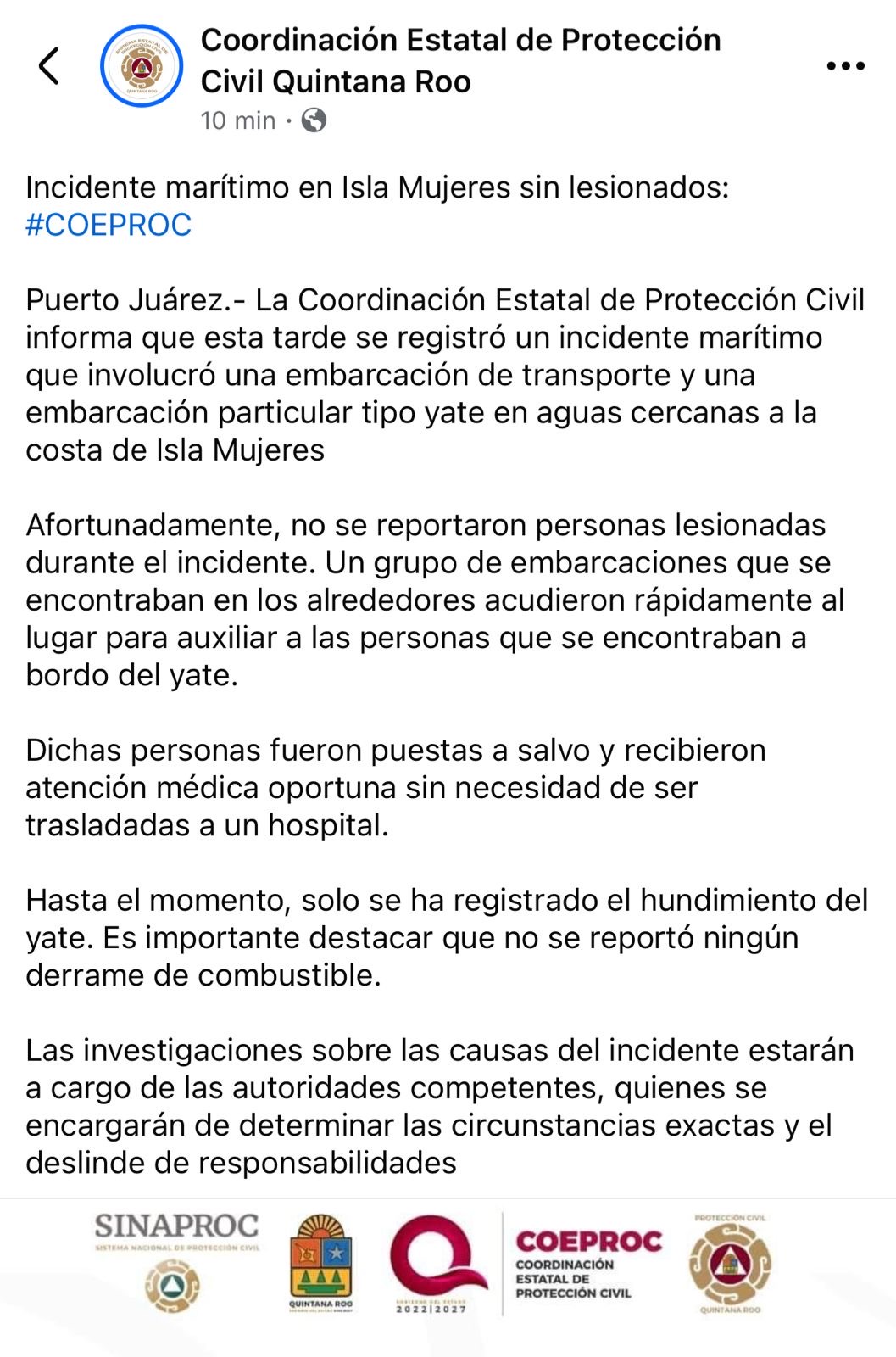 Los tripulantes del yate fueron auxiliados por otras embarcaciones que se encontraban en el área y recibieron atención médica oportuna.