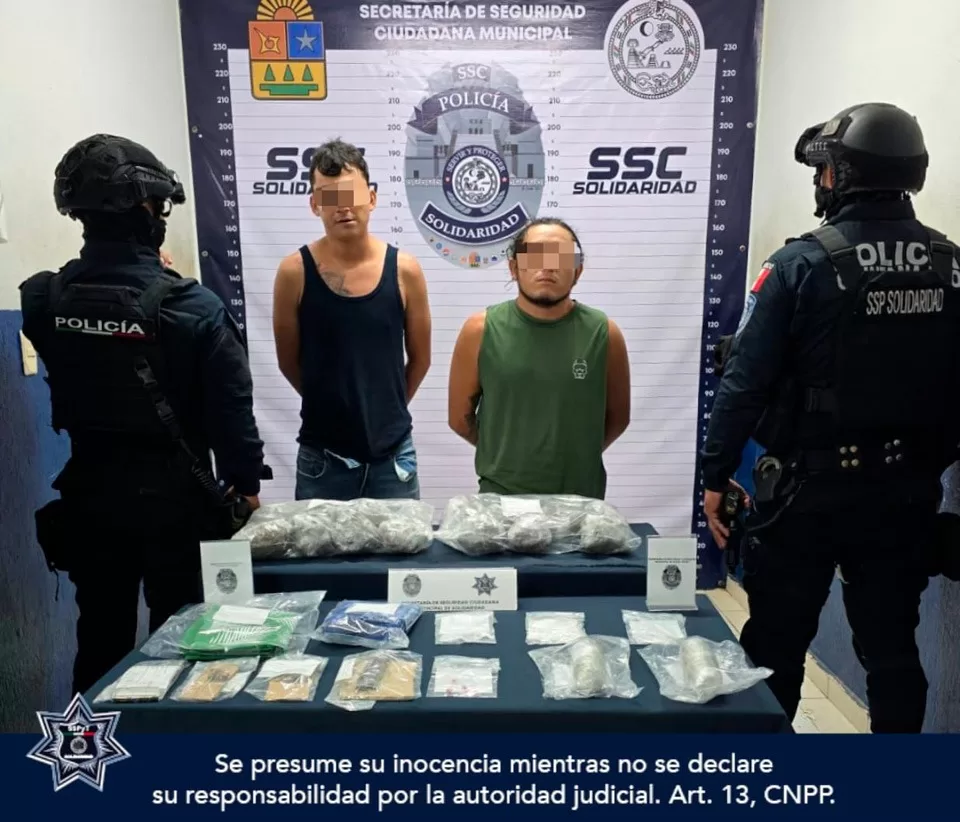 Playa del Carmen, 12 de abril (Infoqroo).- La Policía Municipal de Solidaridad detuvo en la colonia Zazil-Ha, a dos sujetos posiblemente relacionados a la distribución de narcóticos, en posesión de varias dosis de marihuana y la droga conocida como cristal.