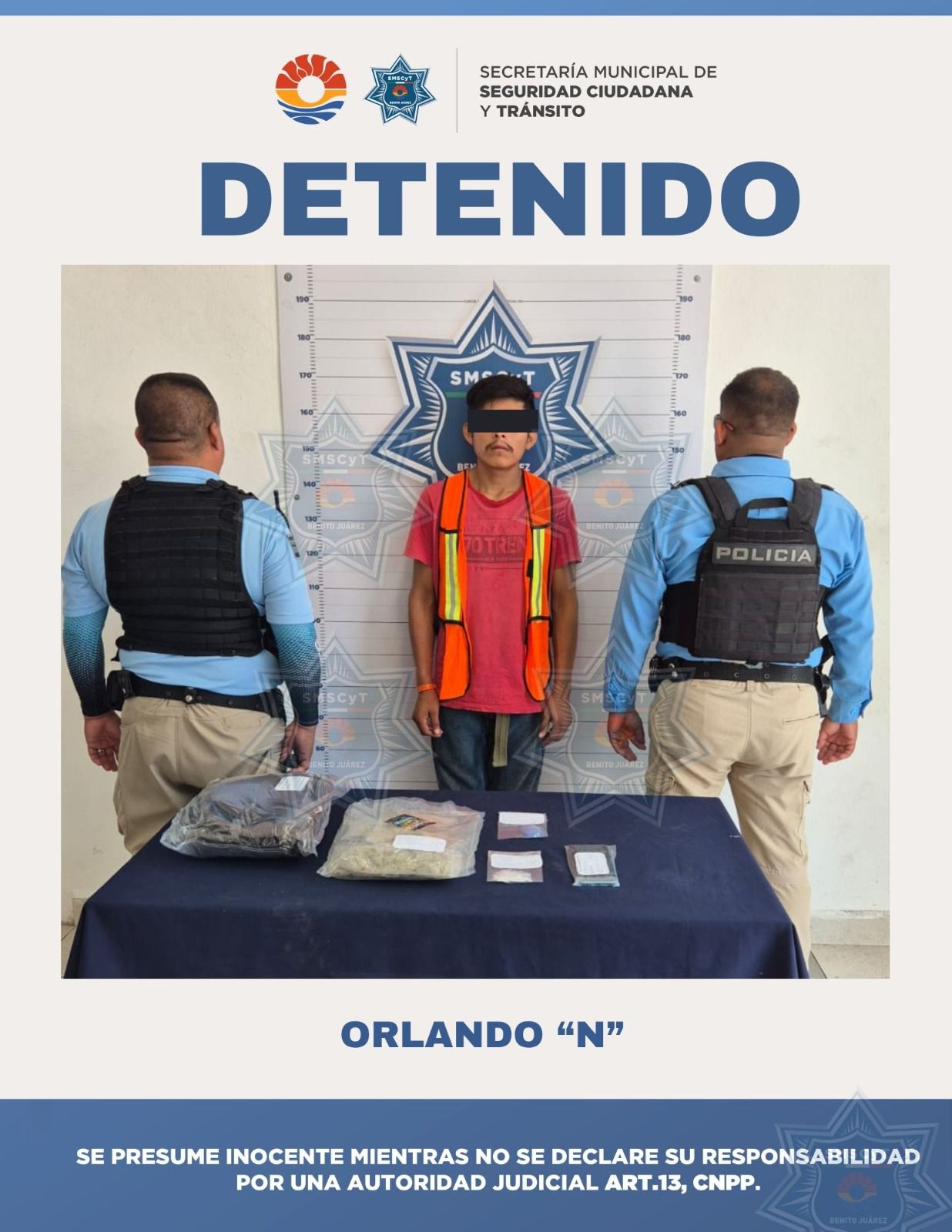 Cancún, 30 de julio (InZoom.Mx).- Agentes de la Secretaría Municipal de Seguridad Ciuda-dana y Tránsito de Benito Juárez detuvieron a Orlando “N”, de 22 años de edad, por su presunta participación en delitos contra la salud.