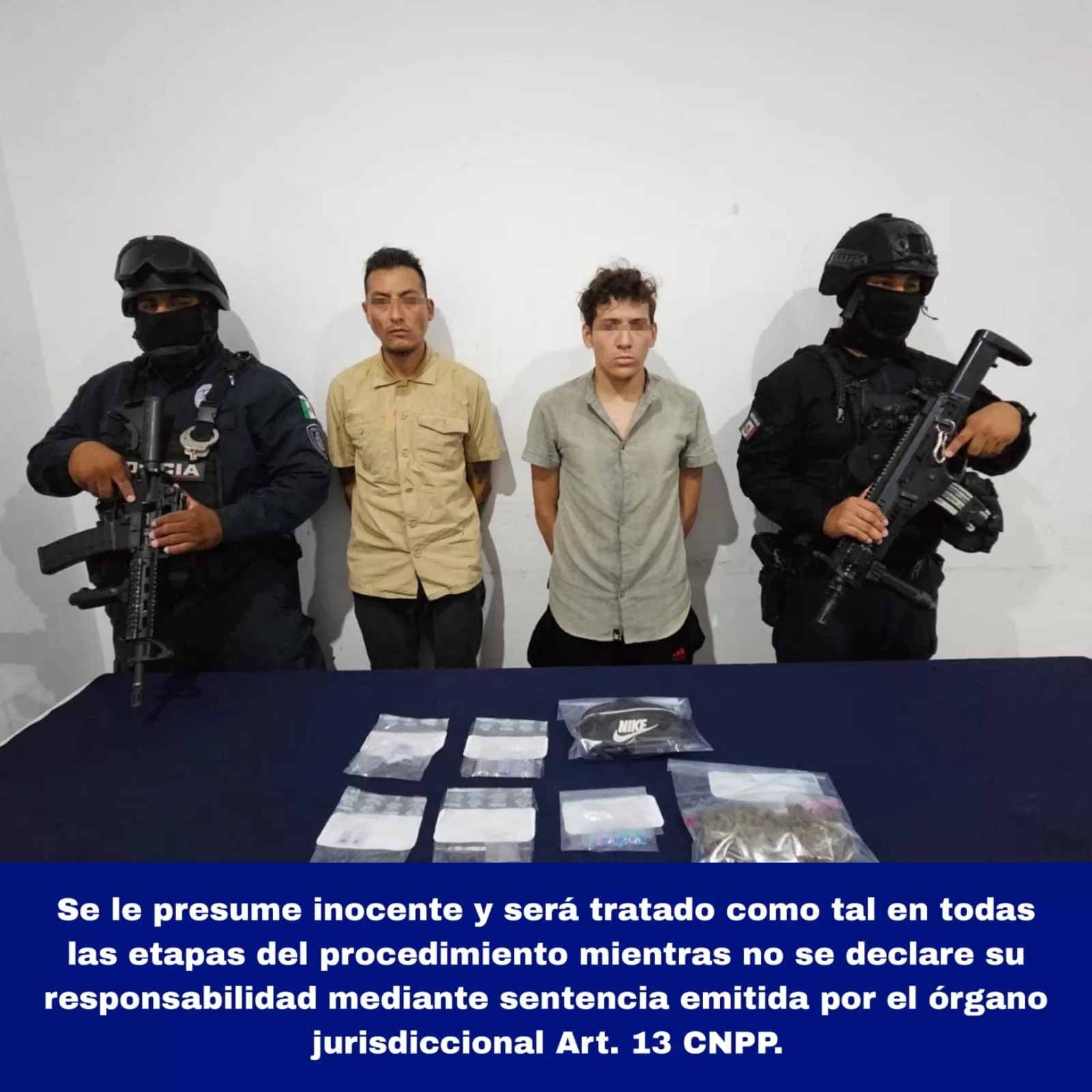 En un comunicado, la corporación estatal refirió que fueron puestos a disposición de las autoridades Emmanuel Ulises “N” y Luis Enrique “N” y que se presume están vinculados a la compra y venta de narcóticos al menudeo en el municipio.