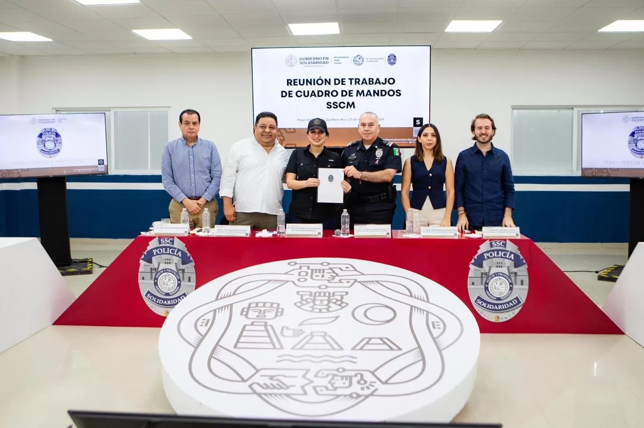 Playa del Carmen, Quintana Roo, 23 de octubre de 2024.— La presidenta municipal Estefanía Mercado sostuvo hoy una reunión con mandos de la Secretaría de Seguridad Ciudadana, marco en el que recibió el Plan Estratégico de Trabajo de la corporación que será clave para la construcción de paz en Solidaridad, con una policía más humanista.