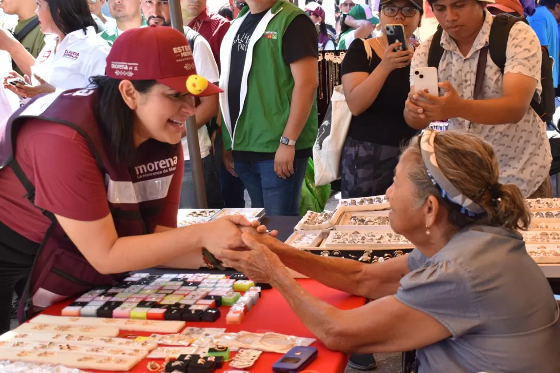 Playa del Carmen, Solidaridad.— La candidata de la coalición “Sigamos Haciendo Historia en Quintana Roo” a la presidencia municipal, Estefanía Mercado, visitó el tianguis comercial de la Colosio, donde fue recibida con aprecio por tianguistas y consumidores que se sumaron al proyecto de transformar Solidaridad.