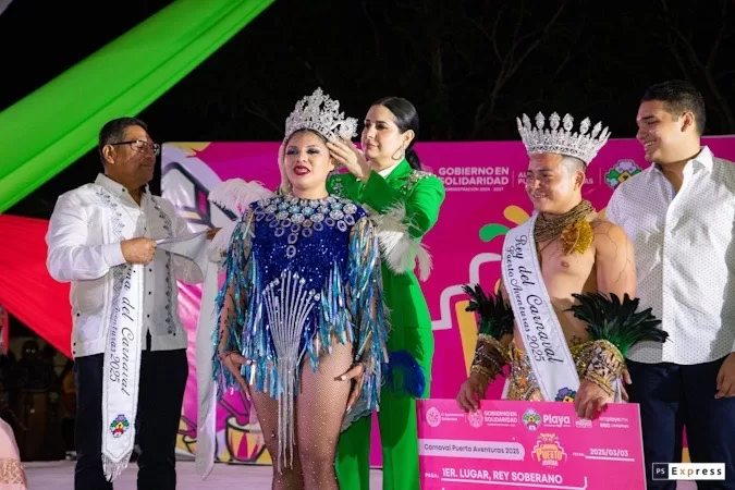 PUERTO AVENTURAS, 4 de marzo.— En medio de un ambiente de algarabía, música y diversión, la presidenta municipal Estefanía Mercado coronó a los soberanos del “Carnaval del Pueblo” Puerto Aventuras 2025, Jeremmy Jissele y Demmys Ariel, así como a las reinas y reyes infantiles, de la discapacidad, adulto mayor, juveniles y de la alegría, en la nueva Plaza Cívica, ante cientos de habitantes de la Alcaldía.